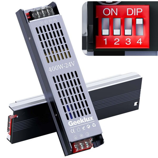 - Advanced technology: the GEEKLUX LED transformer dimmable with 400 W 24 V has soft-start technology, in which the light gradually becomes brighter to protect the eyes and protect LED strips from sudden power surges, which extends the service life. Supports four precise dimming levels (25%/50%/75%/100%) and provides comprehensive protection against overvoltage, overheating, over-current and short circuit, with automatic recovery from faults.