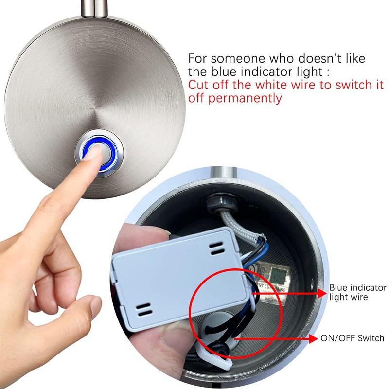• Blue indicator light always on when plug in, make you quickly find the switch at night or in the dark. For someone who doesn't like the blue indicator light : Cut off the white wire to switch it off permanently. See details on the third picture. Attention:this way is irreversible, please know this before you start. Includes mounting hardware and instructions for simple installation on any standard junction box. Easy to install and flexible, could be placed at anywhere that you want.