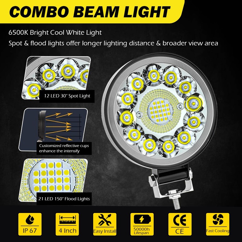 - Deep Cup Reflector Design - 150° flood and 30° spot round led off road light with 21 high-performance LED beads provide you with 9000lm, 6500K of ultra-bright white light.