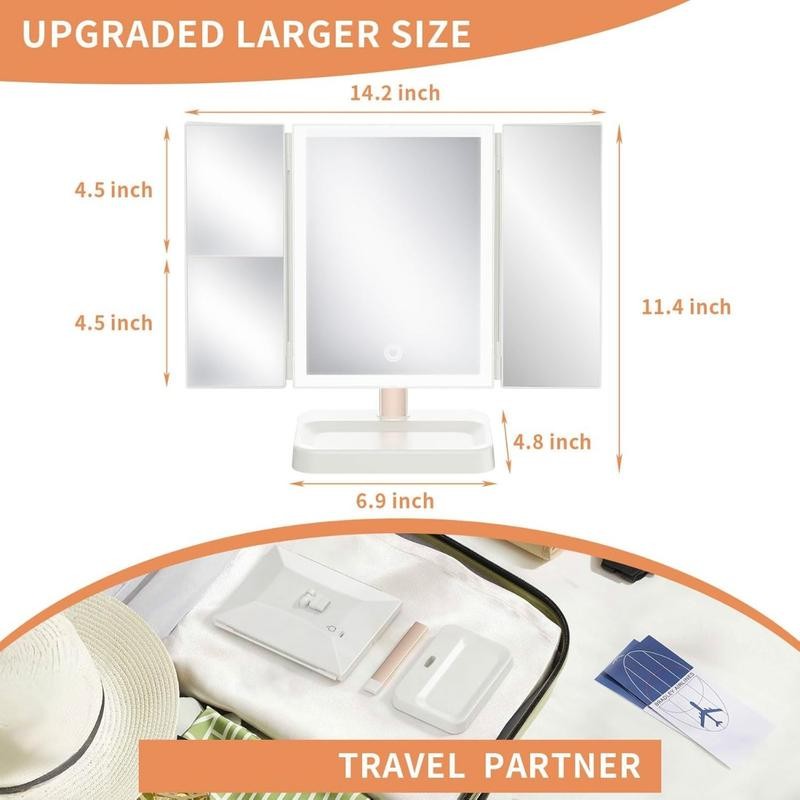 Makeup Mirror Vanity Mirror with Lights, 2X, 3X, 10X Magnification, Touch Control, Trifold, White, 9.4"L x 13.4"W, Modern Style, Dresser Mount, Bathroom