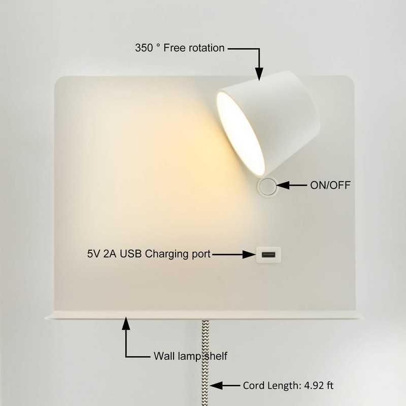 - 【USB Charging Port with Shelf】The plug in wall lamp built-in 5V/2.1A USB ports on the light base, which can conveniently charge your mobile phones, tablets, kindle readers, iPad, iPhone and so on. It also attached a holding shelf, The metal shelf can accommodate mobile phones placed horizontally or vertically, or plants, cups, water bottles, toilet paper, decorations, etc.