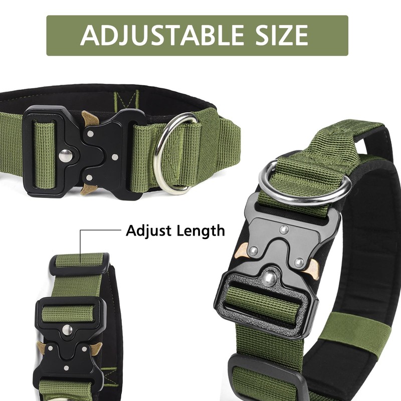 - đ·ïžăHeavy Duty Metal Safety BuckleăOur tactical dog collar boasts a heavy-duty metal buckle with an eagle beak locking design. This feature ensures quick release while preventing accidental opening, thus guaranteeing the safety of your pet and your peace of mind. Additionally, the collar is equipped with a sturdy welded metal D-ring, facilitating easy attachment of a dog leash to keep your dog under control.