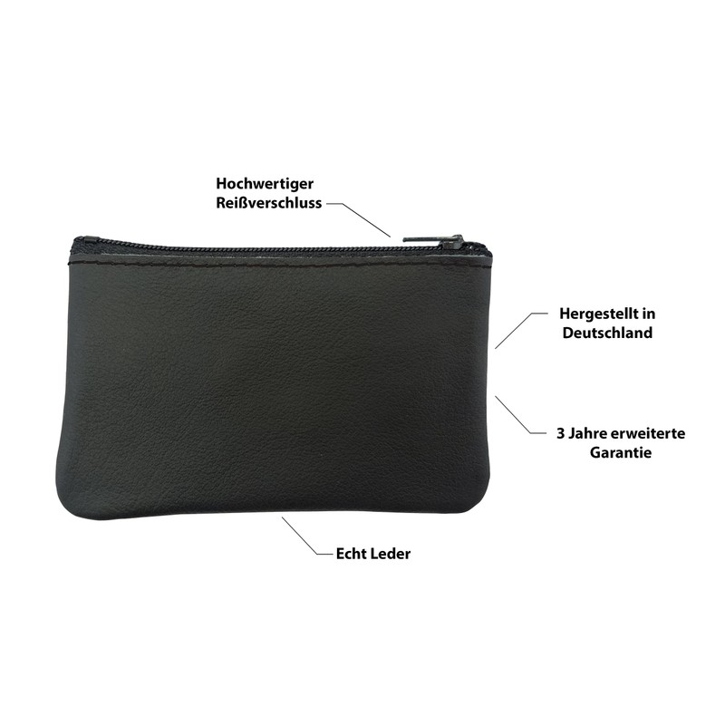- Real leather – key case made of genuine Nappa leather in black with a large zipped compartment with a key ring for multiple keys, as well as a second compartment for change.