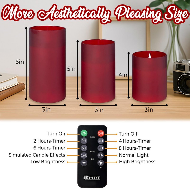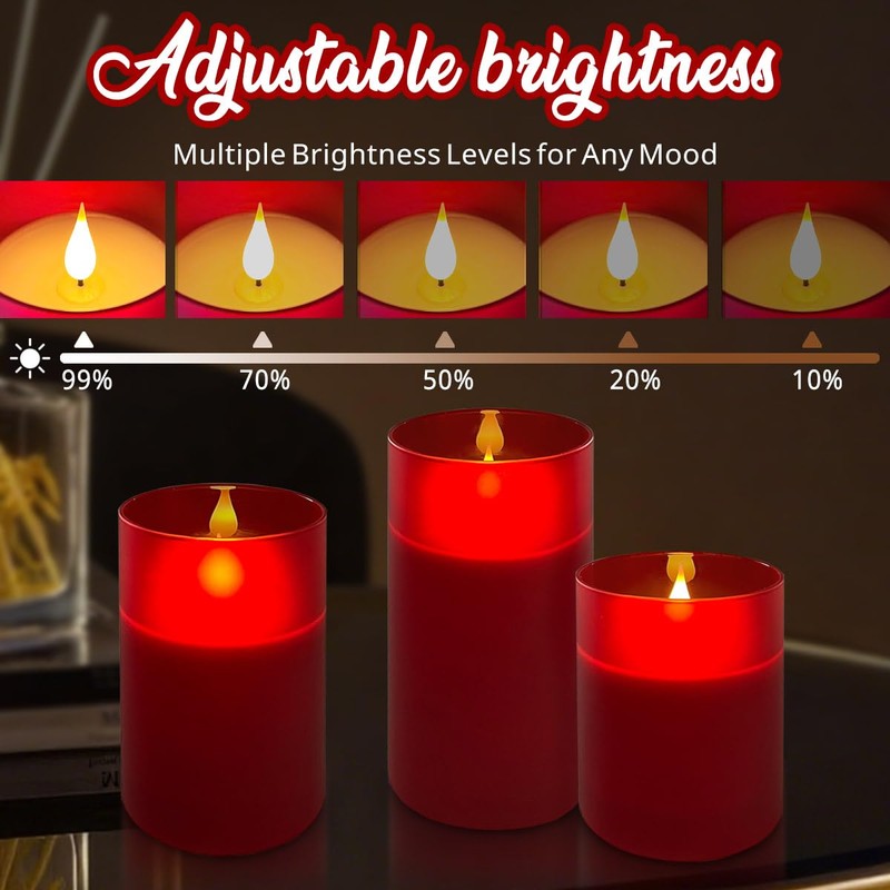• 【Upgraded flame technology】Create the flickering illusion of real flame with flame heart, a set of 3 candle lights with Frosted Red glass, LED candle set with IR remote control, Amber flame candles can be used in bedroom, lounge, study, bathroom, etc. No dripping wax, no fire.