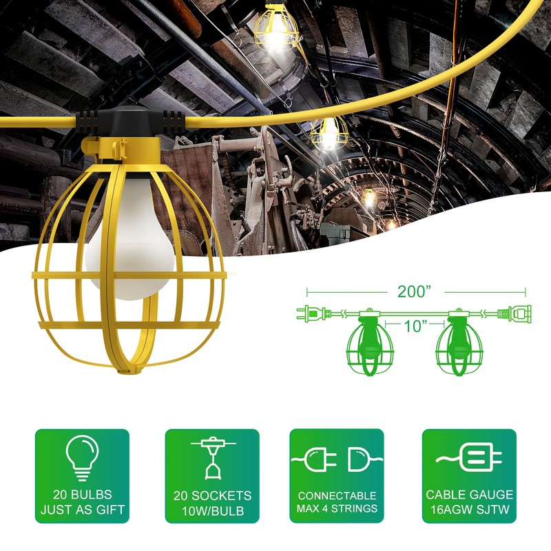 - 【Easy Installation】 - 200-foot extension cord with 20 medium base sockets, our construction lights can be installed at any place you want to hang.