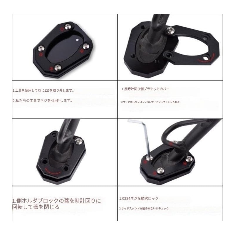 - [Product] This universal motorcycle side stand is made of high quality high strength aluminum. Improves stability when parking in soil, gravel or unpaved areas, and prevents sinking and falling. An allen wrench is also included for easy installation