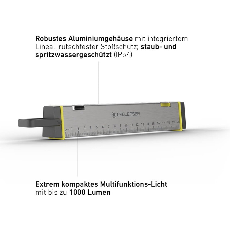 - Robust aluminum housing with integrated ruler, non-slip shock protection; dust and waterproof (IP54)