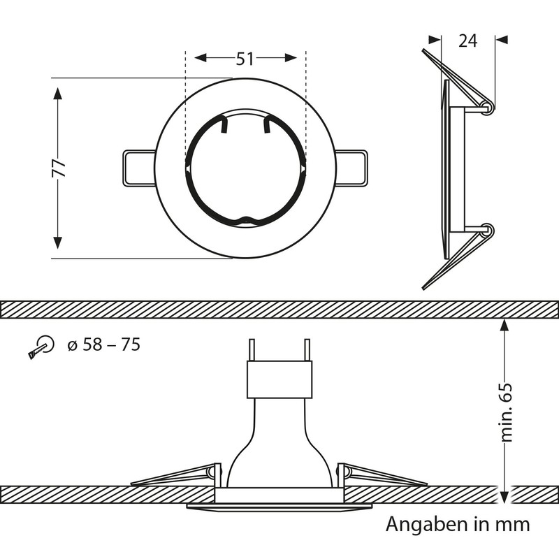 Diameter: 80 mm; Height: 24 mm; Installation diameter: 58 - 75 mm; Installation depth: 65 mm