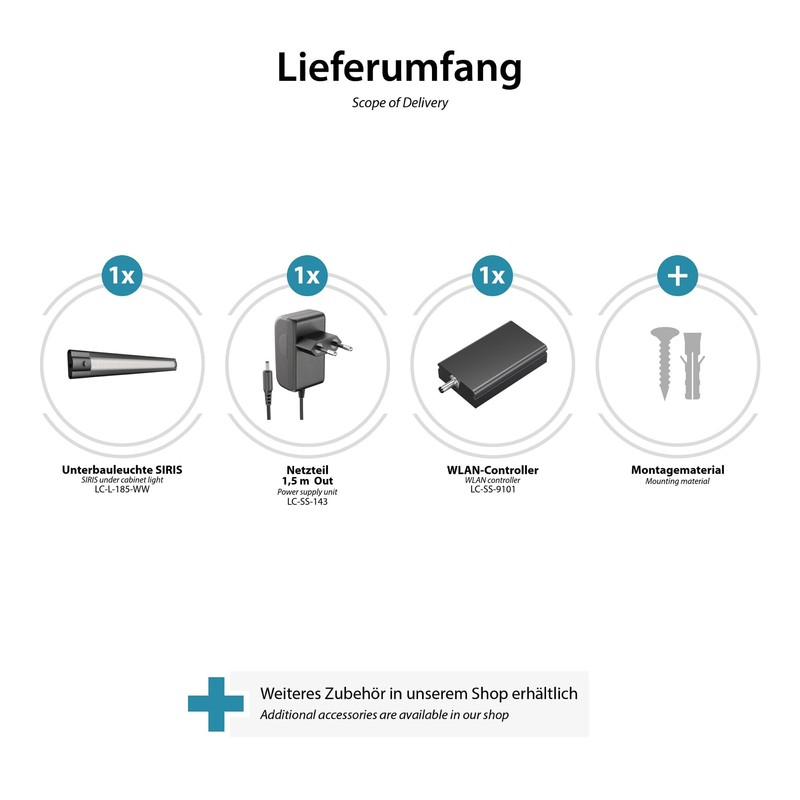 1 x Siris LC-L-185-WW under-unit light (2 x mounting clips, 2 x adhesive strips, 2 x screws), 1 x power supply - LC-SS-143, 1 x WLAN controller - LC-SS-9101 (1 x adhesive strip, 1 x mounting clip, 1 x screw).