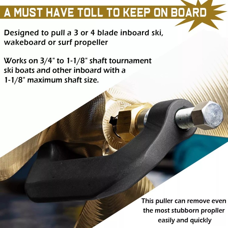 1.Fittment:For Removing your Ski / Wakeboard / Surf Inboard Prop. Works on 3/4" to 1-1/8" shaft, Works great on tournament ski boats and other inboard with a 1-1/8" maximum shaft size. Clearance required between propeller hub and strut is 1/4" minimum.(NOTE: Must have dimple in end of shaft to use)