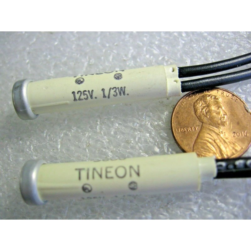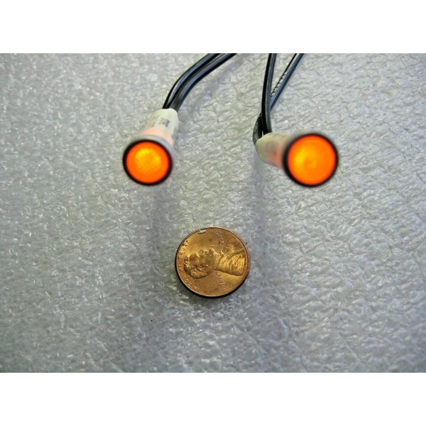 New, lot of 2) Leecraft, 3600, amber, 5/16" diameter, press-fit, 125 volt AC, 1/3 watt, neon, panel-mount, indicator lights prewired with 6" leads as shown. These have the flush type lens. Life expectancy is 25,000 hours.