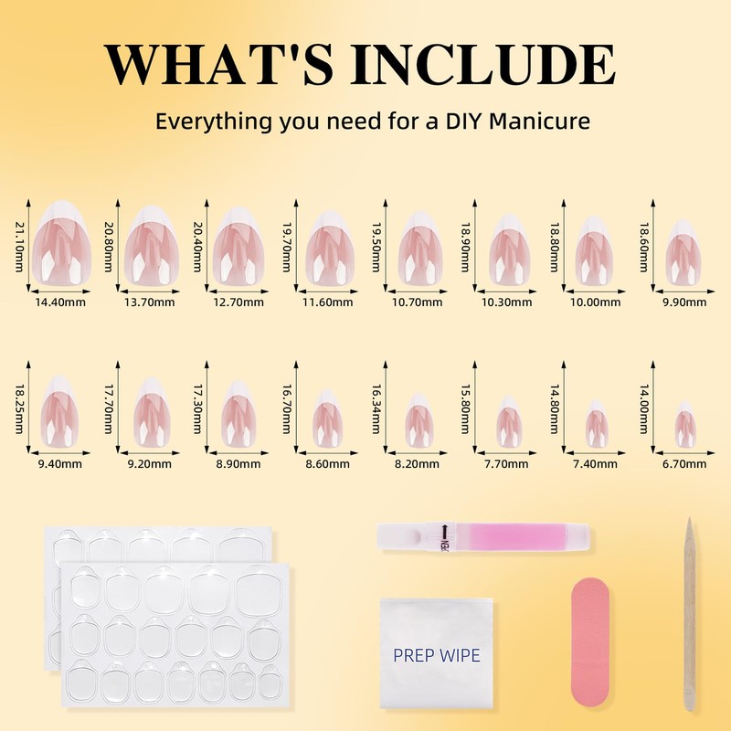 - Premium Press on Nails Kit – This false nails set includes 32 short almond-shaped nails in 16 inclusive sizes, along with nail glue, adhesive tabs, a wooden stick, and a mini file — everything you need for a perfect DIY manicure at home. Finding the right fit for each finger has never been easier