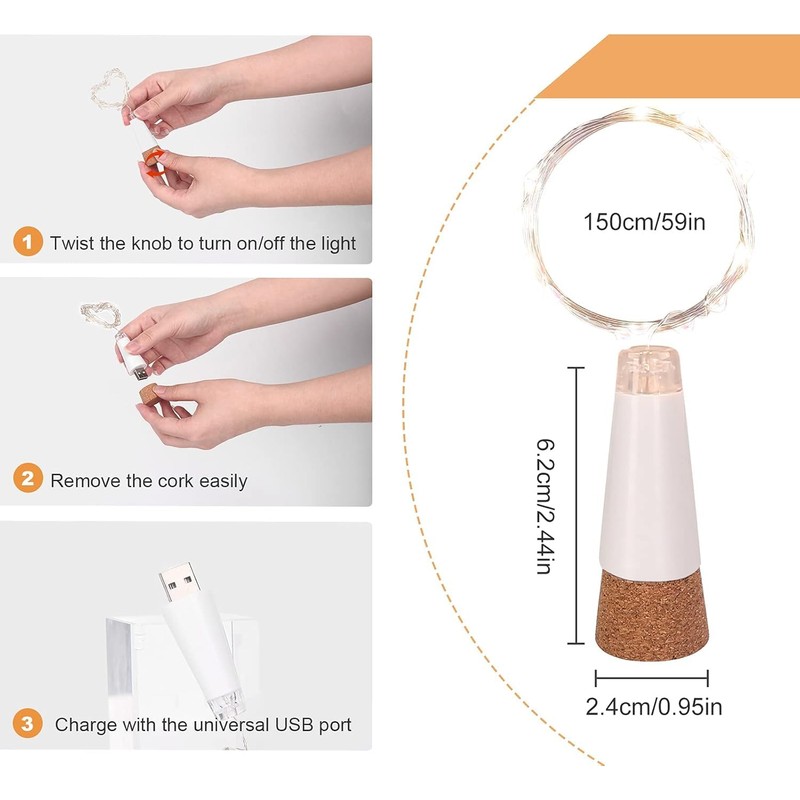 Unique Cork Design: Hidden USB Port & Easy Switch The conical cork stopper design (2.5cm diameter, 6.7cm height) ensures compatibility with most bottle openings. The hidden USB port enhances the sleek appearance, while the transparent end-piece doubles as a rotary switch for effortless control