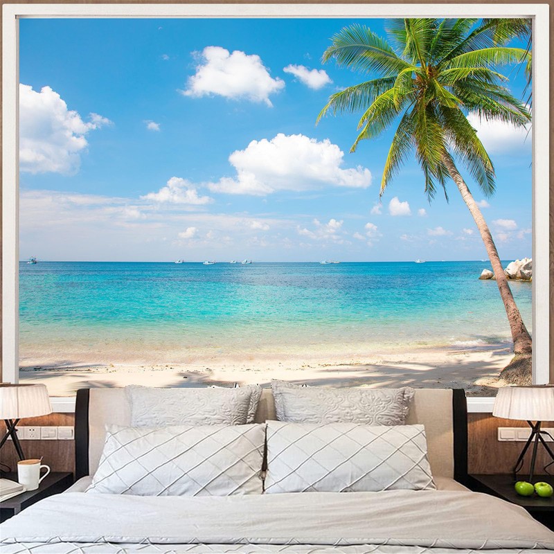 - 【Unique design】: This seaside scenery tapestry outside the window features palm trees and flowers by the beach, blue sky, white clouds, and clear seawater, as well as islands in the distance, bringing a peaceful and relaxed seaside atmosphere to the living room.