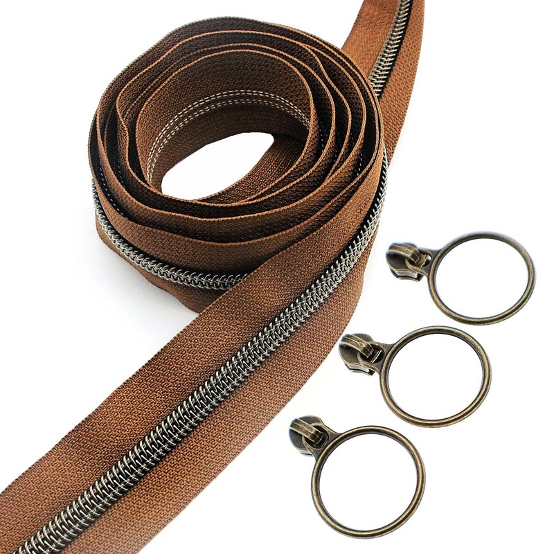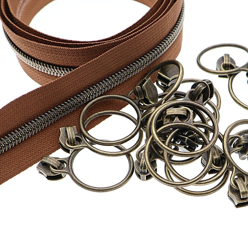 #5 Antique brass Metallic Nylon Coil Zippers by The Yard Bulk 10 Yards Brown Tape with 25pcs Antique brass Sliders for DIY Sewing Tailor Craft Bag Leekayer(Brown)