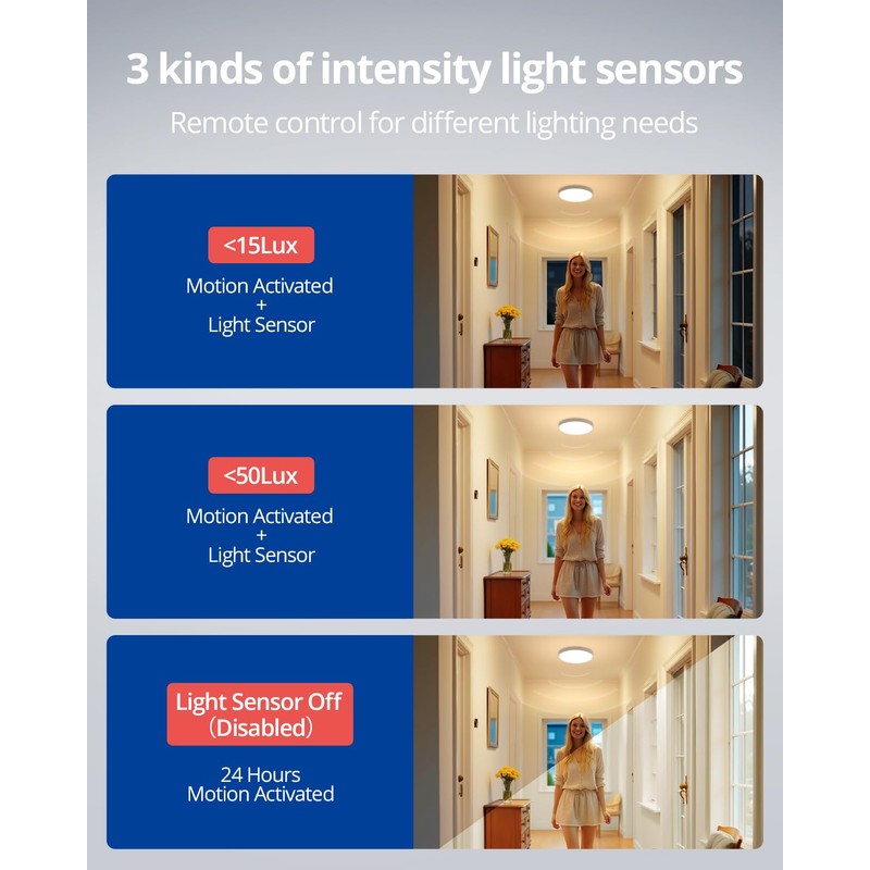 - 【3 Modes Choose】1.Motion activated + light sensor, the radar ceiling light will only detect movement in the dark or below 15/50 lux and the light will turn on; 2.Only motion activated mode, the motion ceiling lamp will light up in daylight and dark when movement is detected; 3.Constant light mode, no motion sensor, no light sensor, the sensor function is turned off and controlled by a wall switch like a normal ceiling light.