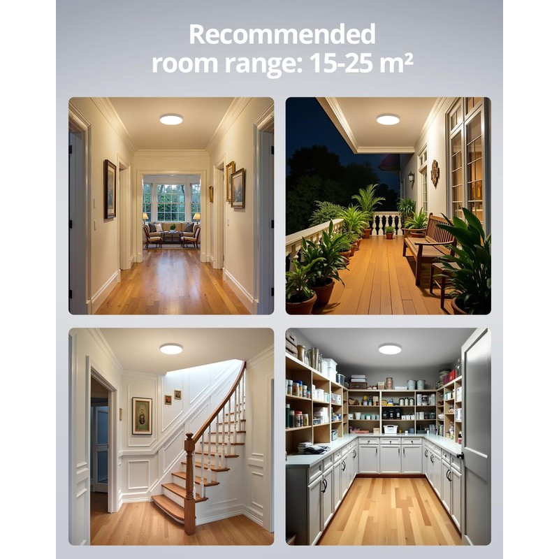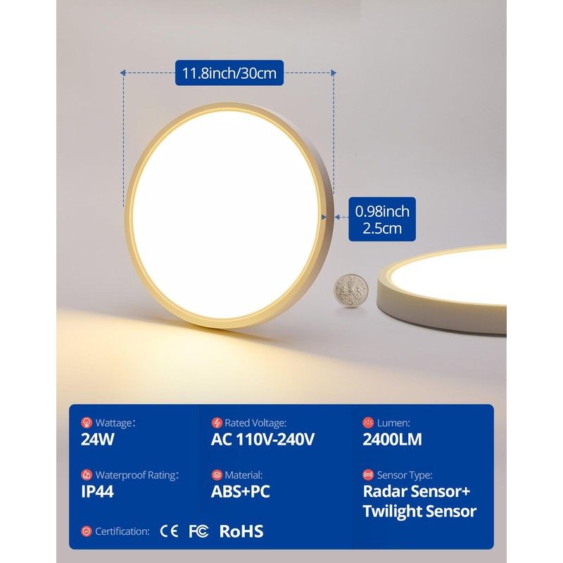 - 【Convenient Sensor Light】The motion sensor ceiling light with radar sensor function, below 15/50 lux, the motion activated light will automatically turn on when moving within 6.5 to 26.6 feet from the light; Sensor lights indoor stays on when someone is present, and the light will automatically turn off after 15s/30s/1min/5min of no movement detected.