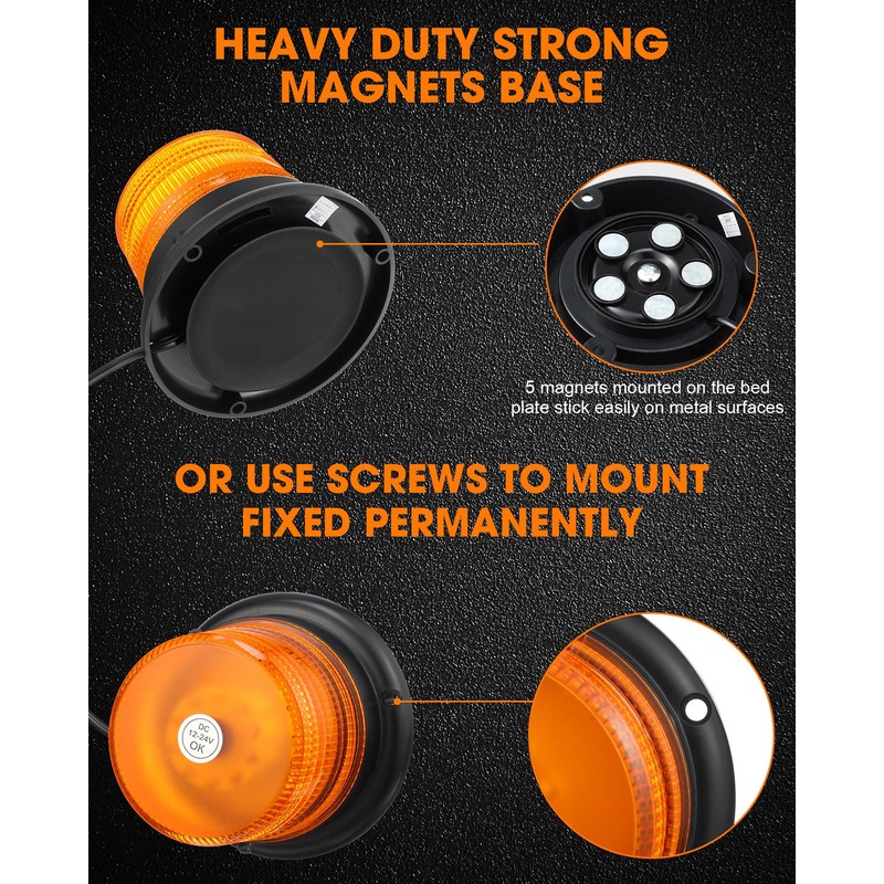 - Easy to Install: there are 2 installation methods, the warning safety emergency flashing lights are designed with magnetic base, these strobe lights with magnetic suction can be firmly fixed on the car, not easy to fall off, or you can fasten with screws, these strobe lights for trucks can be installed anywhere