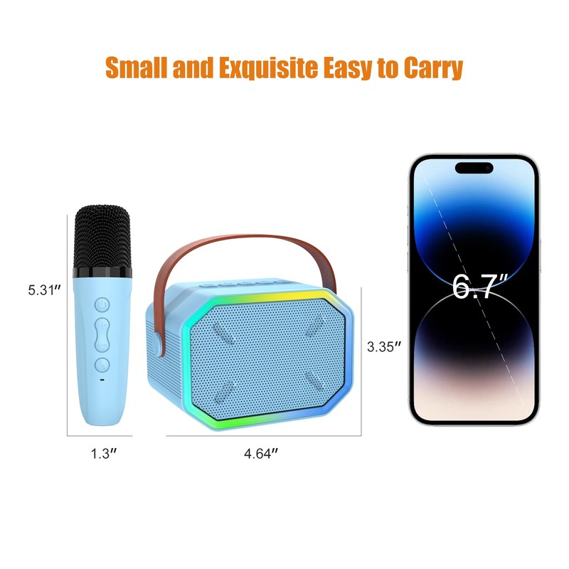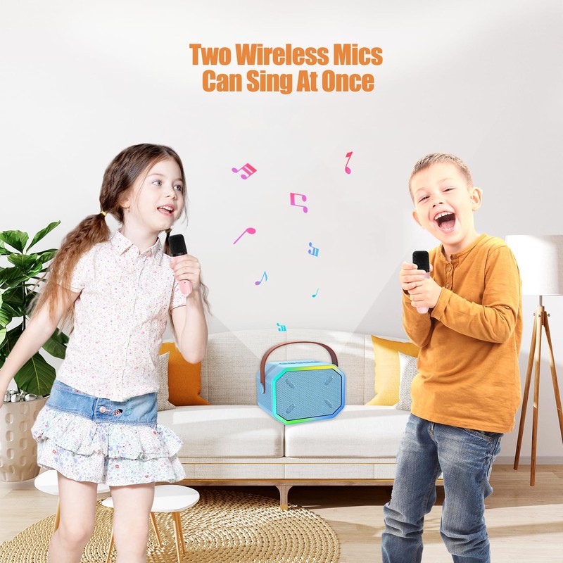 - Mini Karaoke Toy: Two-player karaoke mode by 2 wireless microphones and 1 speaker, it has great range and both microphone sound and Bluetooth music plays crystal clear, small size but powerful and loud in sound, portable and easy to carry, so kids can take their music go to everywhere.
