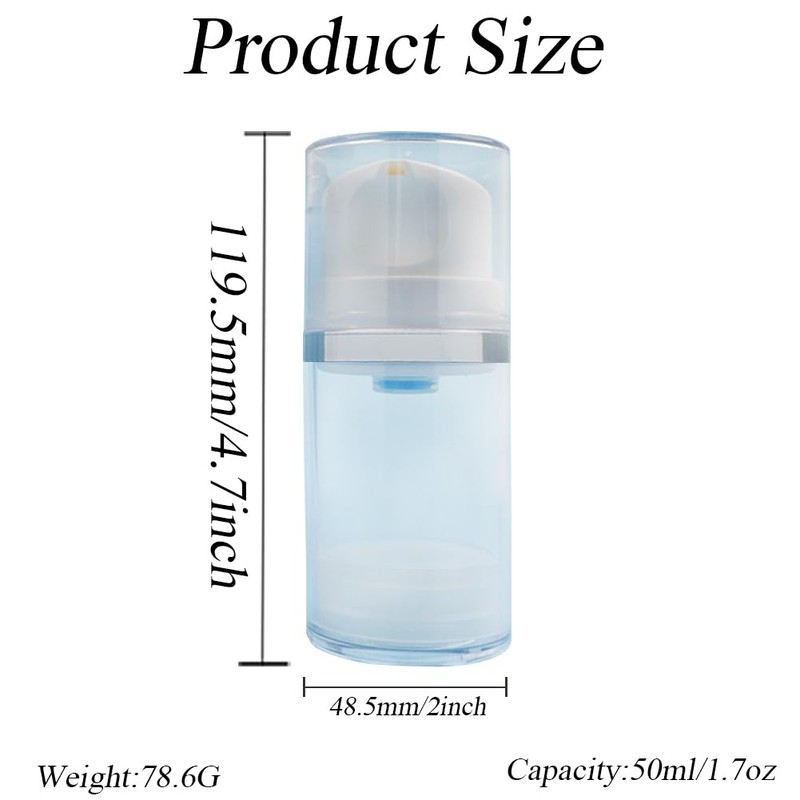 - Farbe: transparent + weiß; Fassungsvermögen: 50 ml; Größe: ca. 48,5 x 119,5 mm (Durchmesser x Gesamthöhe); Gewicht: 165 g (luftlose Pumpflaschen + verpackt); Material: Kunststoff