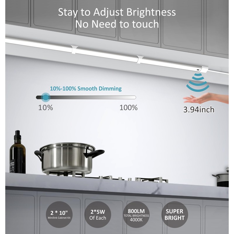 - Hand Wave Motion Sensor: Simply wave your hand within 3.94 inches to turn ON/OFF the motion activated under cabinet lights. Dimmable - adjust the brightness (10%-100%) by staying your hand on front of the sensor. Perfect for kitchens, counters, desks, and cupboards. No wall dimmer needed
