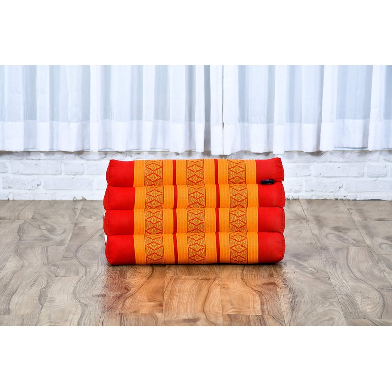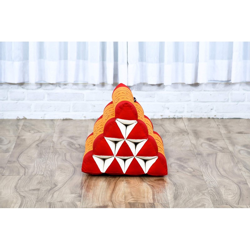 • ''' Our decorative triangle pillows are filled with new, untreated kapok, a plant fibre extracted from the fruits of a tropical tree. Firm but comfortable padding. Suitable for apartment, terrace, garden, outdoor, boat.#||# Leewadee Thai pillow in premium quality: double seams for extra long durability! High quality cover in traditional Thai design.#||# Our original triangular wedge cushions from Thailand are handmade with loving care - responsibly and sustainably as part of the OTOP Thailand project.#||# Dimensions(WxHxD): 20x13x13 inches; Material: Kapok; Colour: orange red'''