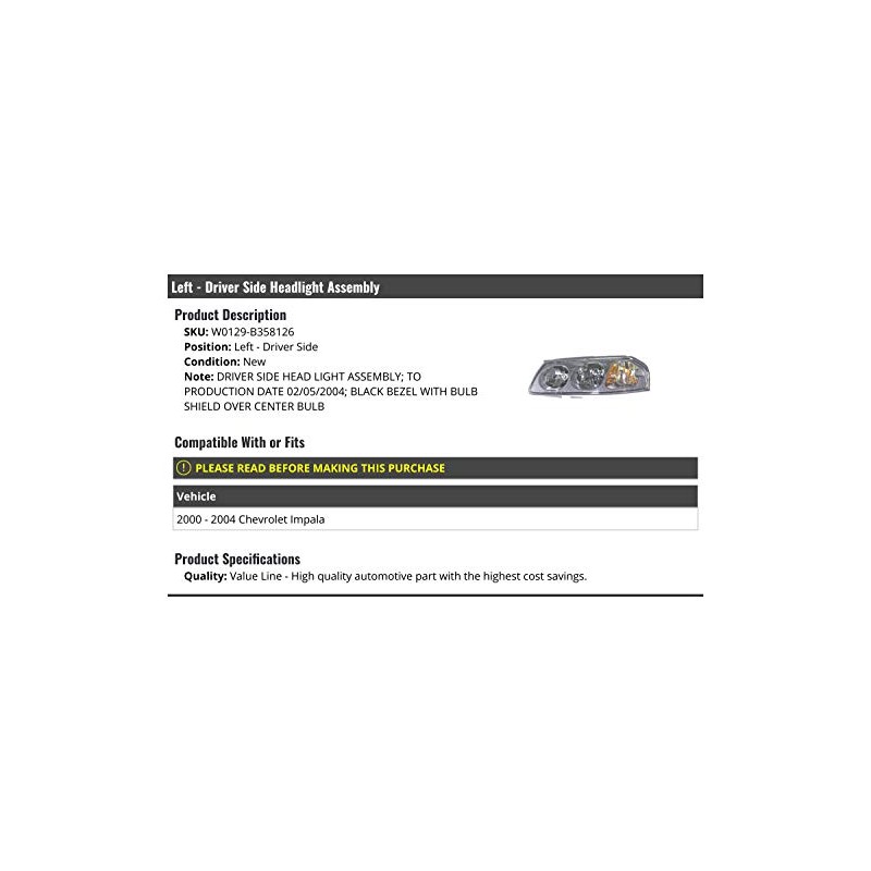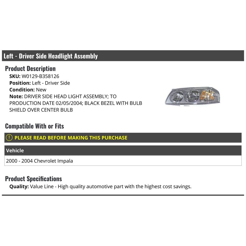 Left Driver Side Headlight Assembly - Black Bezel with Bulb Shield Over Center Bulb - Compatible with 2000-2004 Chevy Impala (Up To 2/05/2004)