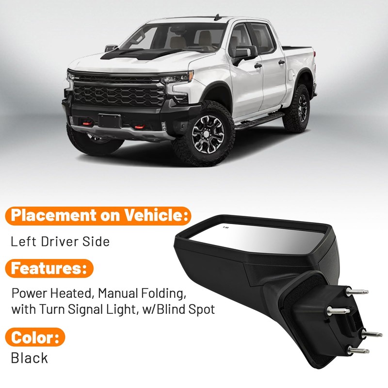 - 【Specifications】: Position: Front Left; Plug: 7Pins; Features: Power Heated, Manual Folding, with Turn Signal Light, w/Blind Spot; Color: Black.