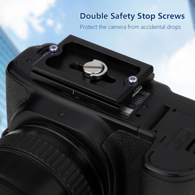 - 【デュアルセーフティシステム】- 2つのストップスクリューが偶発的な落下を防ぎ、撮影中にカメラを固定します。