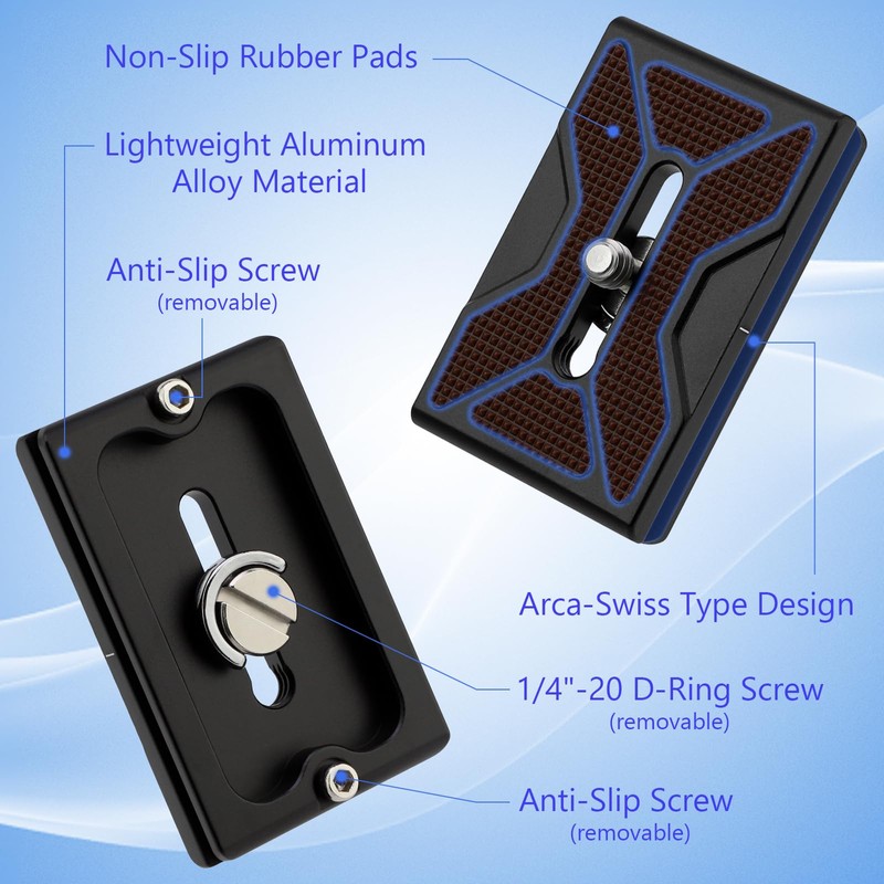 1/4インチのDリングネジで数秒で取り付け、取り外しができます。 ダブルセーフティストップスクリューが偶発的な落下を防ぎ、滑り止めゴムパッドがカメラを安定させ、傷をつけません。