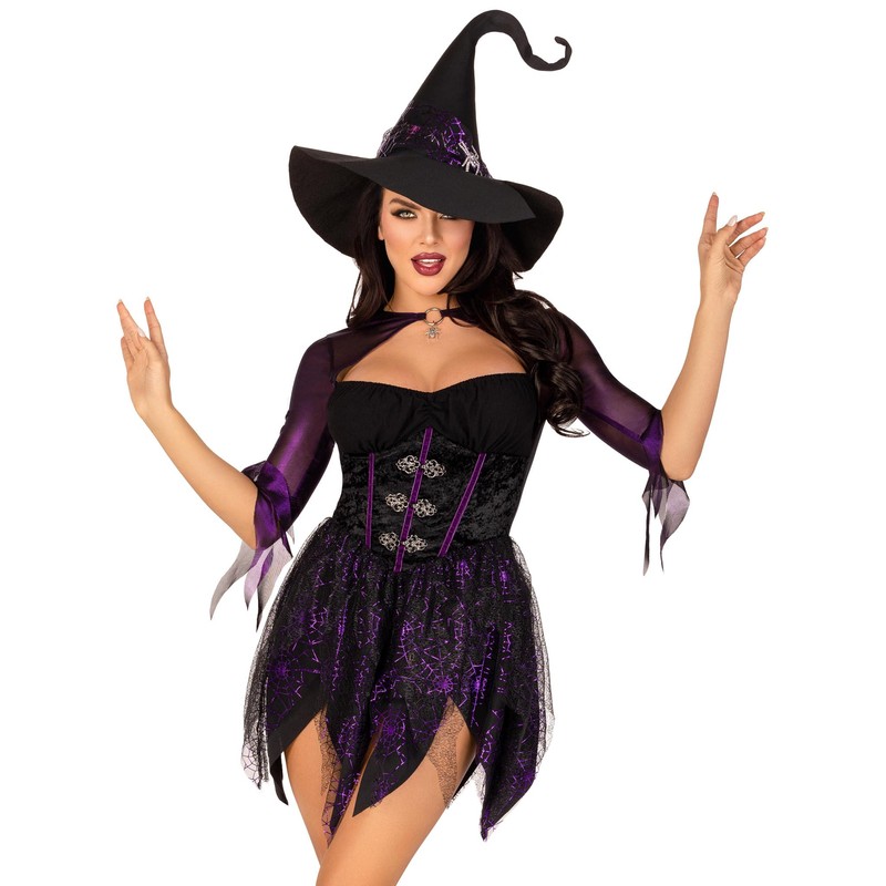 LEG AVENUE 2 PC Mystical Witch, includes dress with spiderweb tattered skirt, velvet waist metal clasp accents, and tattered witch hat with wired point