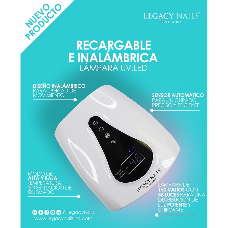 LEGACY NAILS Professional RECHARGEABLE & CORDLESS LED NAIL LAMP - Automatic sensor - 150-watt lamp with 36 lights - High power mode.