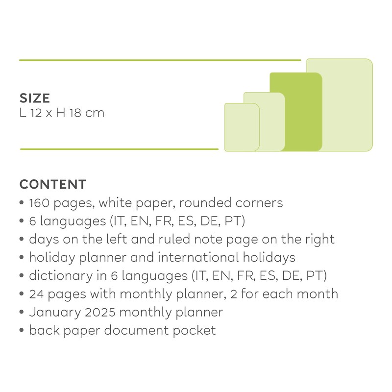 - Features: 160 pages. 6 languages: IT, EN, FR, ES, DE, PT On one side of the week, on the other side there is a space for writing notes and notes. Holiday Plan, Party List, Dictionary, Address Book, Monthly Planner and Monthly Planner January 2025 Elastic closure Paper pocket Bookmark Rounded corners. Single Cellophane