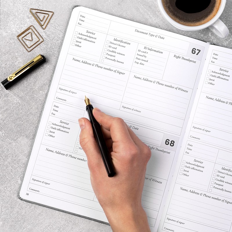 • PRE-PRINTED ENTRIES FOR ALL ESSENTIAL INFORMATION – Each entry provides space to record all essential information, including the date, time, fee, and service type; signer’s contacts, ID information, and thumbprint; witness’ contacts; their signatures.