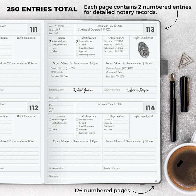 • FULLY COMPLIANT WITH U.S. RECORDKEEPING GUIDELINES – This notary book is compliant with the legal notary records journal guidelines in all U.S. states, except for Illinois and Hawaii. The notarial journal has 129 numbered pages with 250 numbered entries.