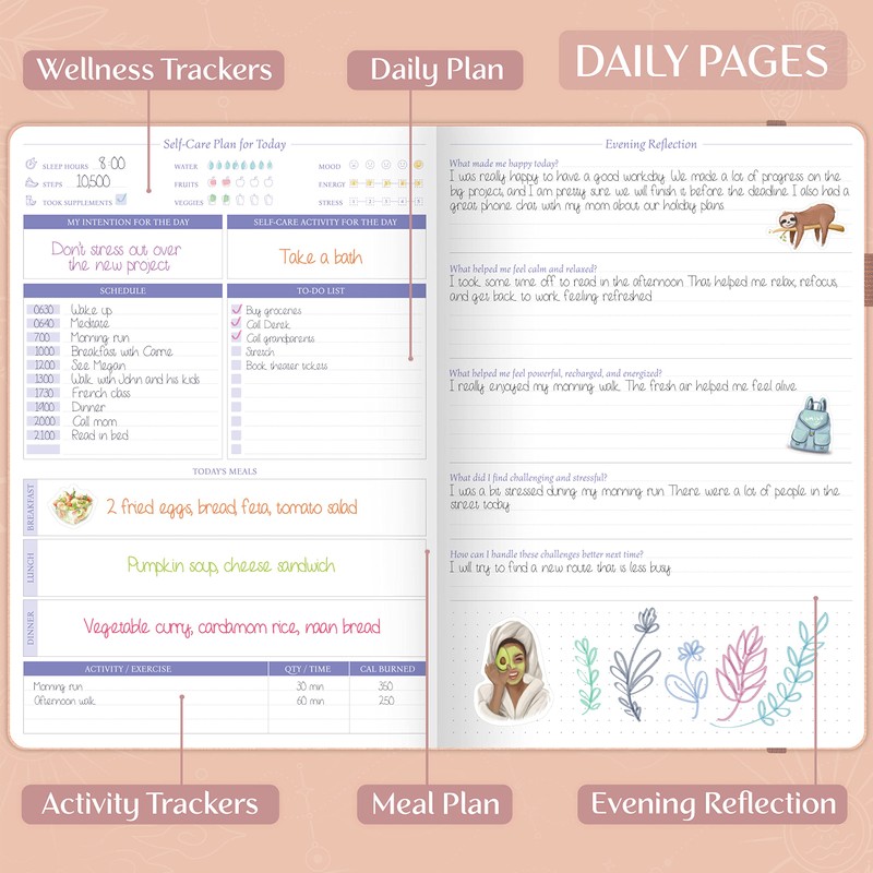 - TRACK ALL ESSENTIAL WELLNESS DATA IN ONE PLACE: Use convenient daily trackers to track your sleep hours, step count, supplements, water intake, daily meals, physical activity, and more. This way, you can notice if something is lacking and make adjustments.