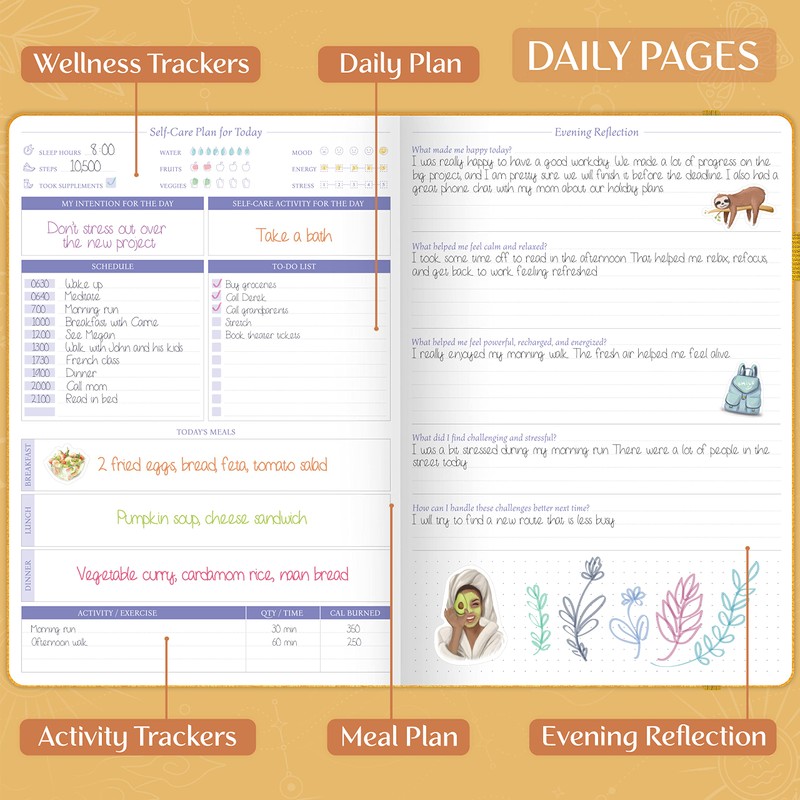 • FOSTER MINDFULNESS WITH DAILY JOURNALING PAGES: Each day includes an evening reflection page to unwind and reflect on your day. The prompts on this page help you become more aware of your feelings to better care for your mental and physical well-being.