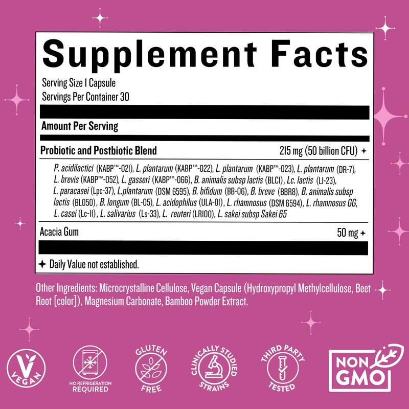 - YOUR DAILY PINK PILL: Ditch the pre pro & postbiotics supplement stacking and just take 1 easy-to-swallow capsule each day, no refrigeration required!
