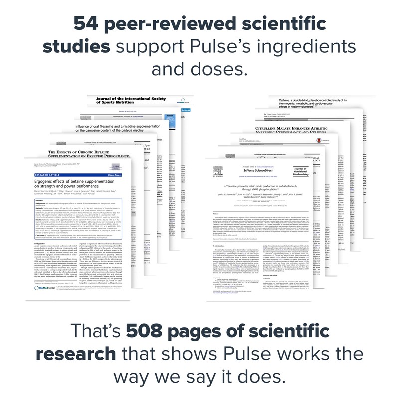 - 54 peer-reviewed scientific studies support the effectiveness of Pulse preworkout's precise combination of ingredients and doses. That's 508 pages of scientific research that shows Pulse prework out works the way we say it does.