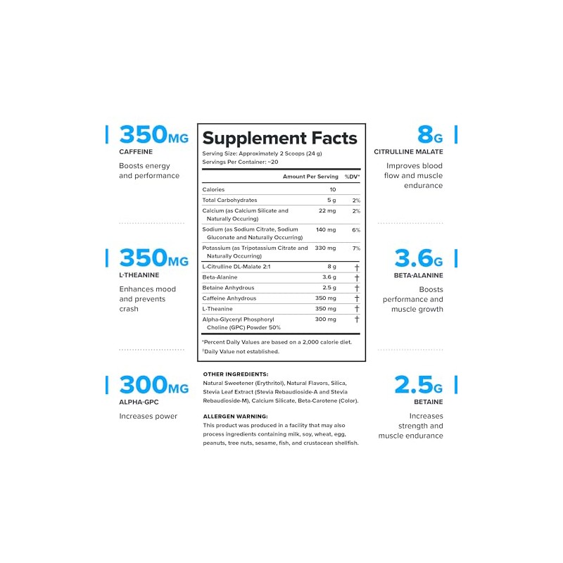 - Clean pre workout and transparent label that shows exactly what's in every serving of our preworkout for men and women and what's not (no proprietary blends or hidden ingredients).