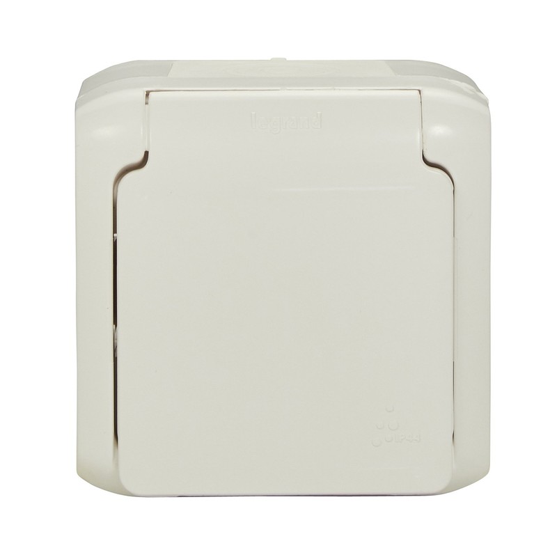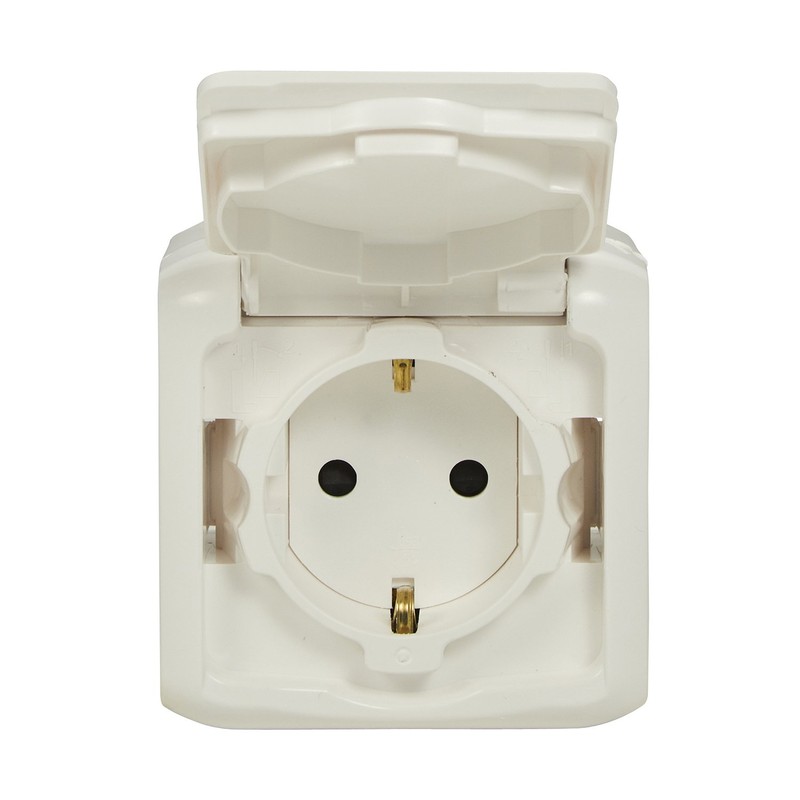 - 1-way wet room surface-mounted socket with child protection and lid, 2-pin, for the nominal voltage of 250 V and a rated current of 16 A