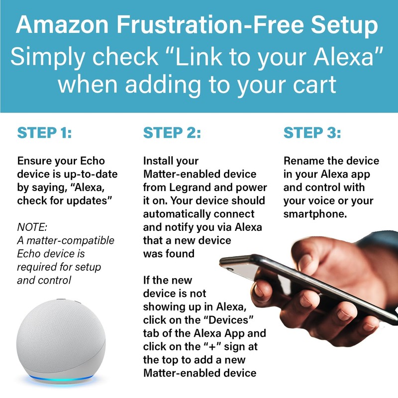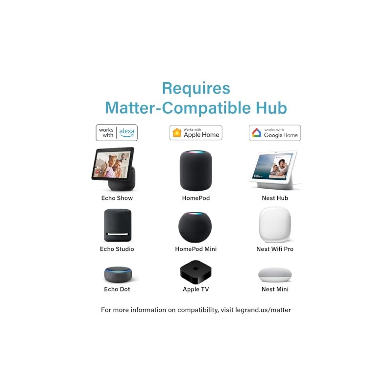 - Matter Hub Required. A Matter-compatible hub is required for successful setup. Most leading smart home hubs and assistants are compatible out-of-the-box with Matter – Apple HomeKit, Google Home, Amazon Alexa, and Samsung SmartThings. Refer to smart home details with manufacturer