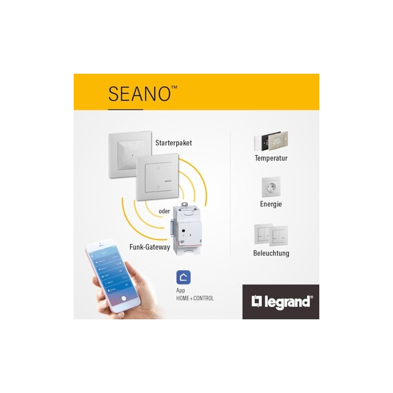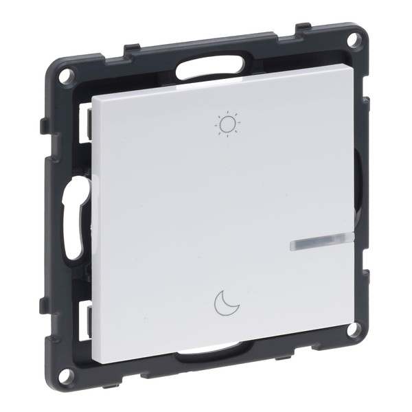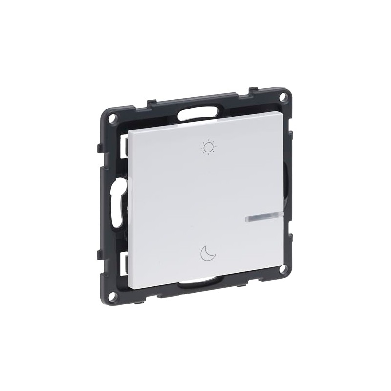 - Scene button: The Seano scene button "day/night" allows the creation of everyday scenarios for the time of bedtime and waking, e.g. lighting, roller shutters and sockets. These scenarios can be set up via the HOME + CONTROL app.