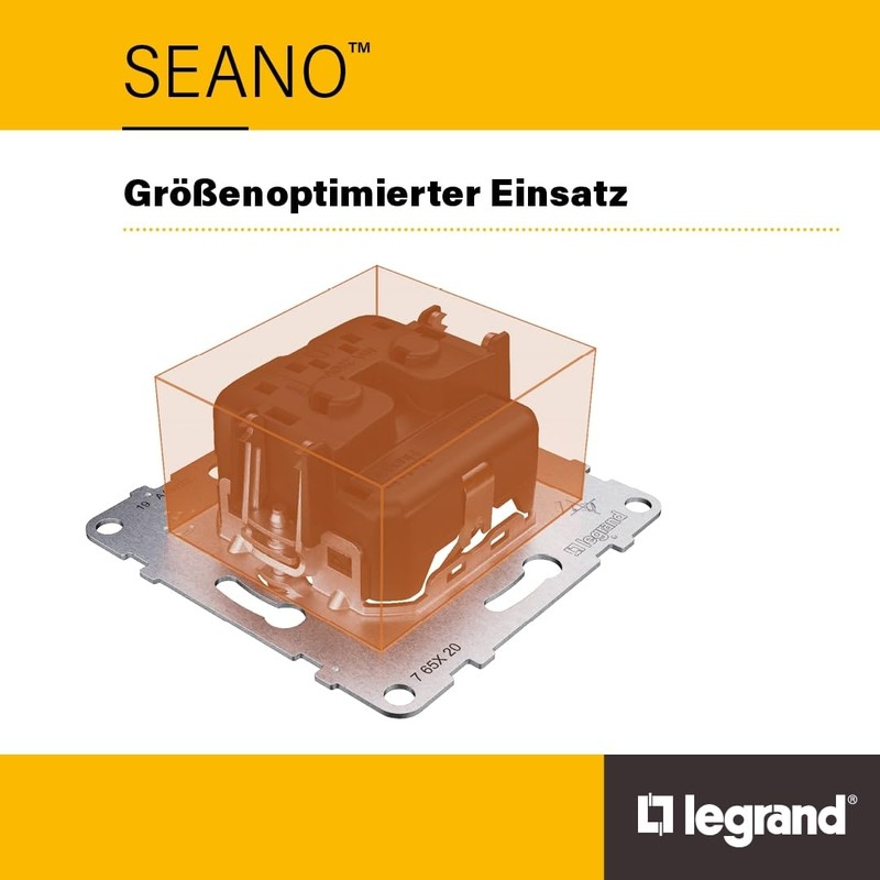 - Construction: the switch concept from Seano does not require a rocker counter plate. The all-in-one system consists of rocker carrier, plaster compensation spring and integrated counter plate. Seano is designed for the integration of 55 x 55 third-party products (e.g. KNX).