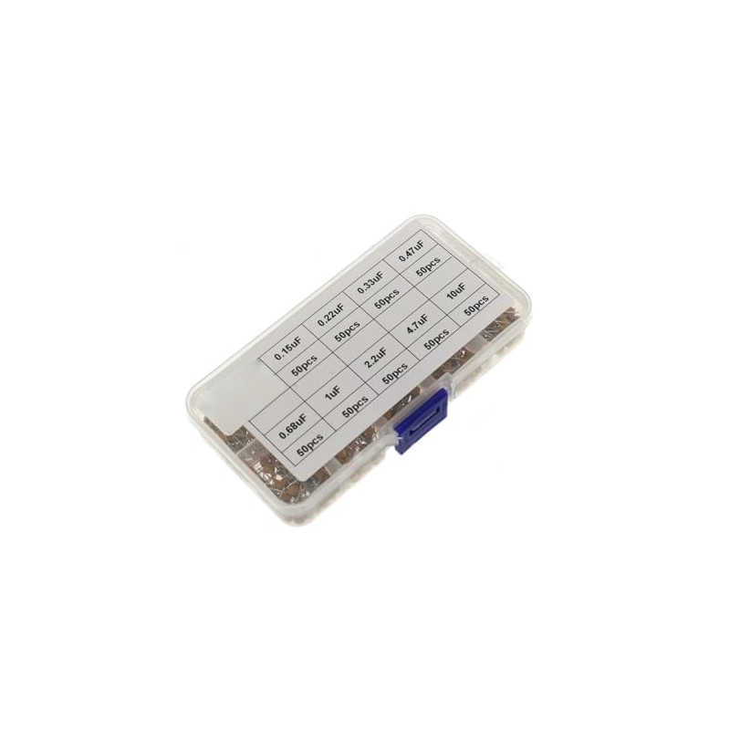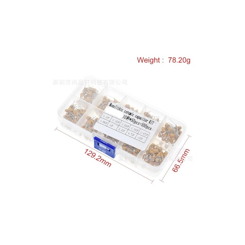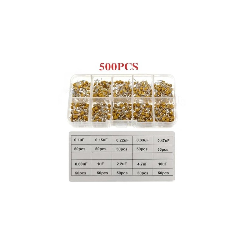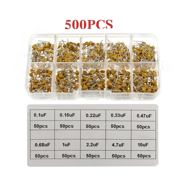 - Monolith capacitor set. Package quantity: 500 pieces (50 pieces per model) in a sturdy and convenient resealable plastic storage box.
