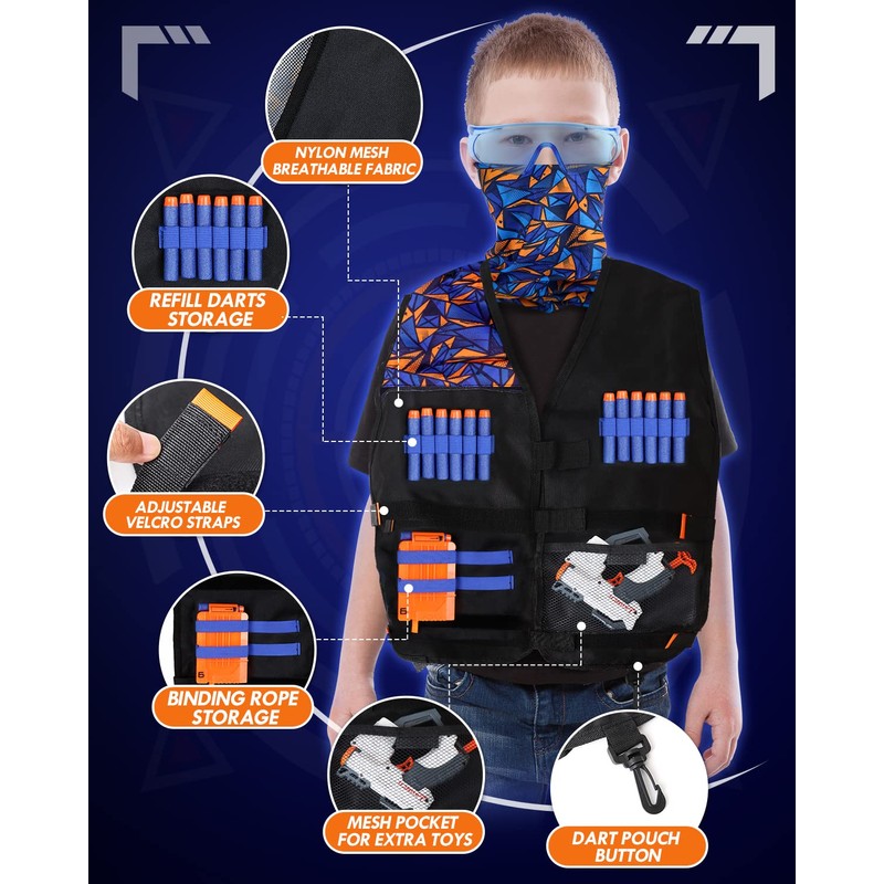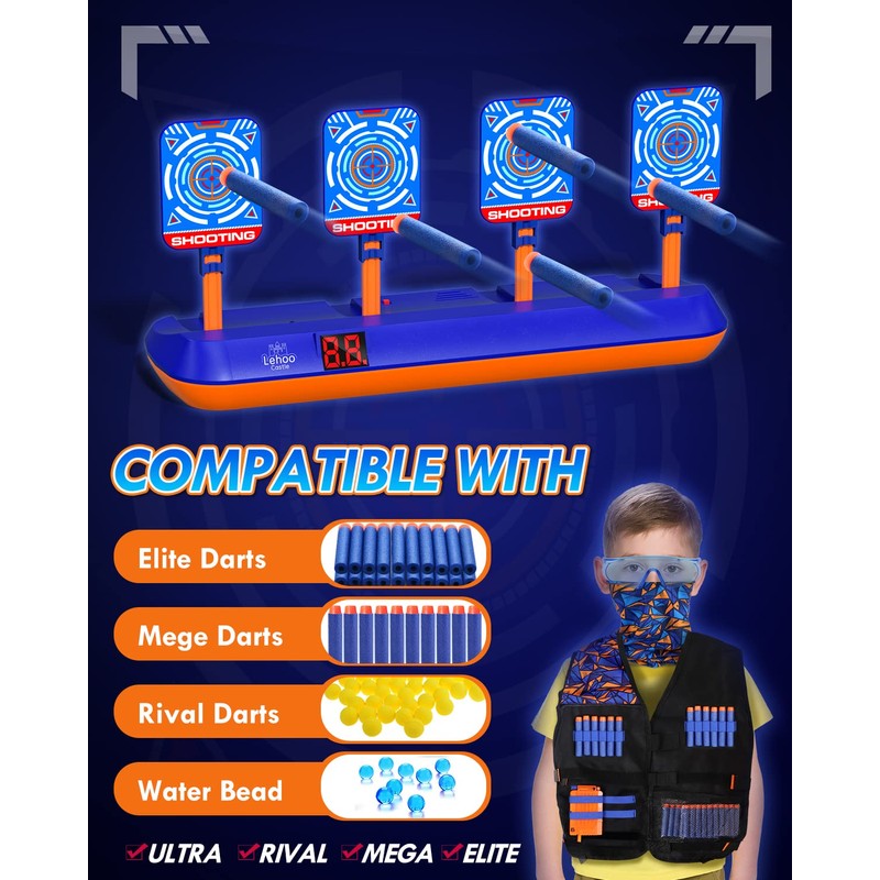 - Fully equipped electronic shooting target kit: Package includes - An electronic scoring shooting target * 1 (4 targets), shooting game vest * 1, goggles * 1, multi-functional mask * 1, foam bullets * 60, instructions * 1, wrist strap * 1.