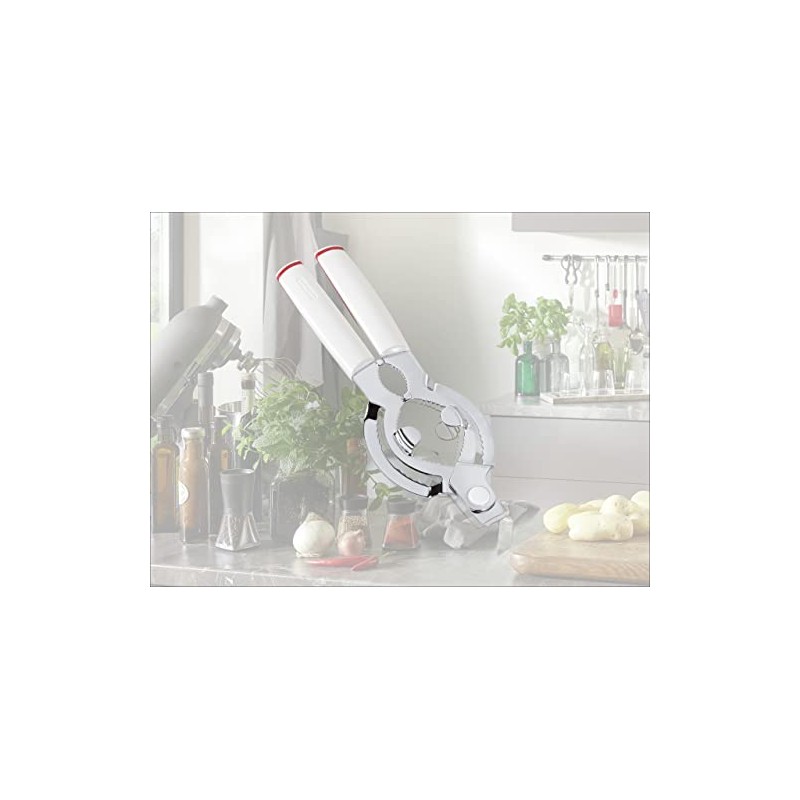 The Leifheit kitchen utensils with the comfort handle. The two-zones handle of the tin opener consists of two plastics that perfectly complete each other. The white plastic stands for stability, cleanness and hygiene. The soft zones in trendy red lie there, where force is used during the handling and where particular slip resistance is needed. The function also convinces : the ComfortLine tin opener opens glasses, bottle and tubes effortlessly and is equipped with a handy cap lifter. The ovale shaped handles lie well and safely in the hand. , With two-zones handles for the perfect handling , Opens glasses, bottles, tubes, etc. effortlessly, with cap lifter , Ovale shaped handle for a safe handling Leifheit article number: 3135 , Pack contains:1 Leifheit Tin Opener ComfortLine with Cap Lifter, Glass Opener, Tube Opener, Bottle Opener, 3135