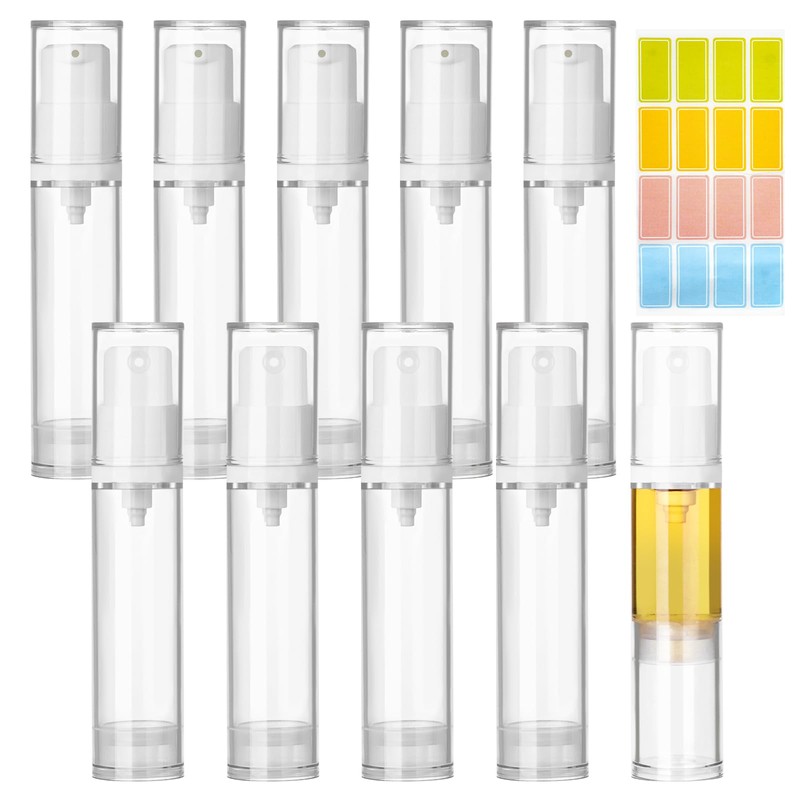 • 10ml Airless Pump Bottle Set: Set includes 10pcs 10ml lotion pump containers, 1pc colourful label sticker! Easily handwrite the contents of the bottle (e.g. toner, essence, day cream, night cream, etc.) to quickly identify different skincare products and avoid confusion, so that travelling storage is more orderly.