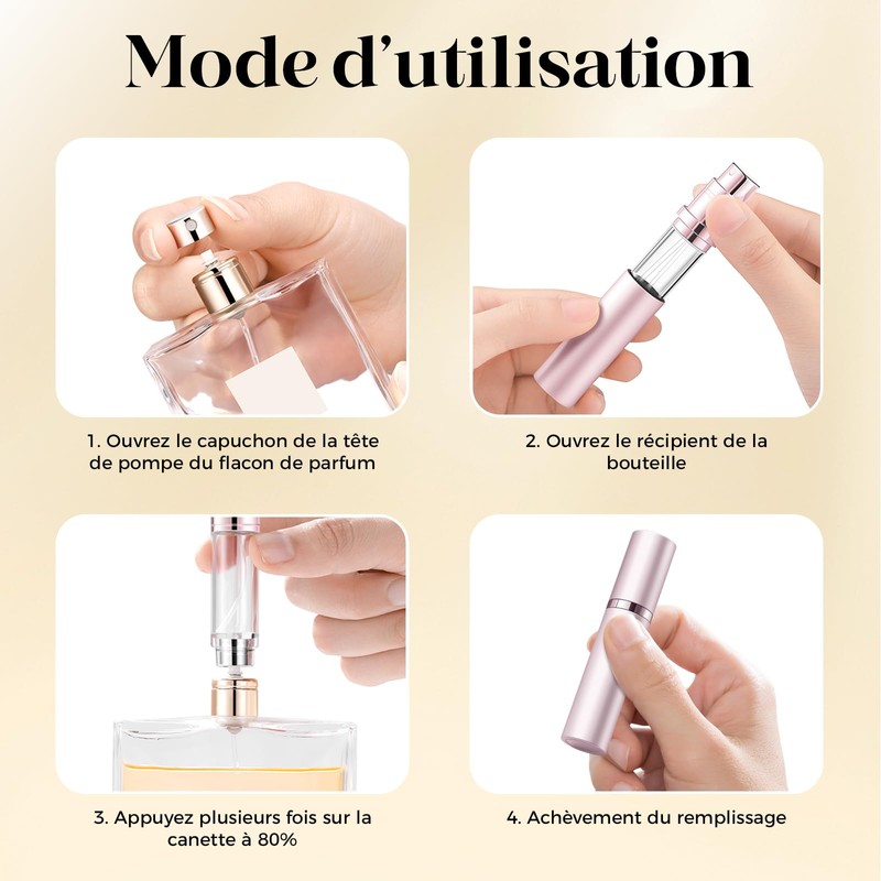 - Wiederverwendbar, auslaufsicher: Unsere Parfümflasche für Reisen kann nachgefüllt werden. Der Boden hat eine präzise Füllstruktur, um ein Auslaufen zu verhindern, einfach die Basis entfernen, auf die Parfümflasche legen und mehrmals pumpen, bis der Zerstäuber voll ist.