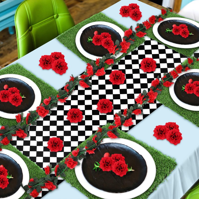 - Nice Size for Immersive Decor: get lost in the vibrant details of your wonderland party setup; Each lawn square placemat measures 11.8 x 11.8 inches/ 30 x 30 cm with a comforting height of 0.6 inch/ 1.5 cm, while black and white checkered diamond table runner measures 13.8 x 108.3 inches/ 35 x 275 cm; The rose heads boast a diameter of 1.77 inches/ 4.5 cm, and the rose vines stretch a generous 8.2 ft/ 2.5 m, ensuring a seamless immersion in this enchanting theme